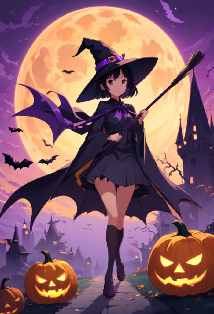Sea Artでハロウィンのイラスト生成。 アニメ風にハロウィンを作成 同じプロンプトでアニメ風に作成しました。 コウモリが闇夜を舞い、不気味なカボチャの幽霊が微笑みます。不気味な月が空に浮かび、幽霊ほうきが風に揺れます