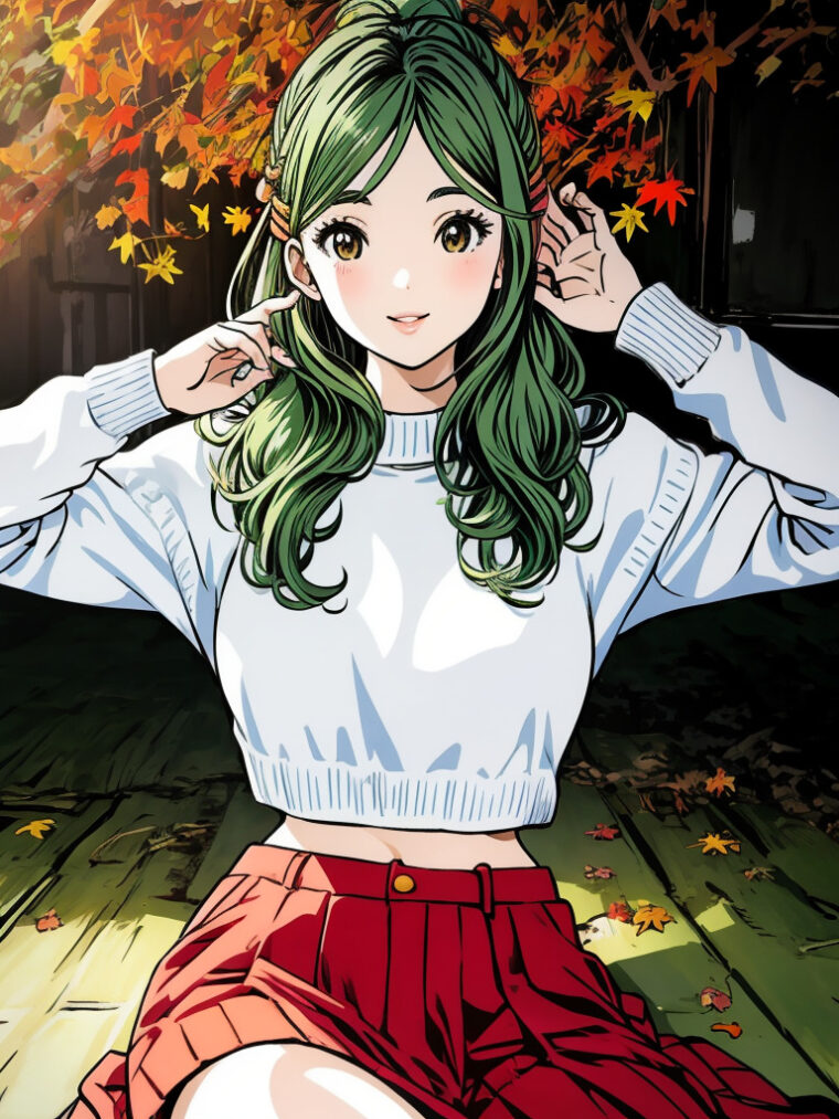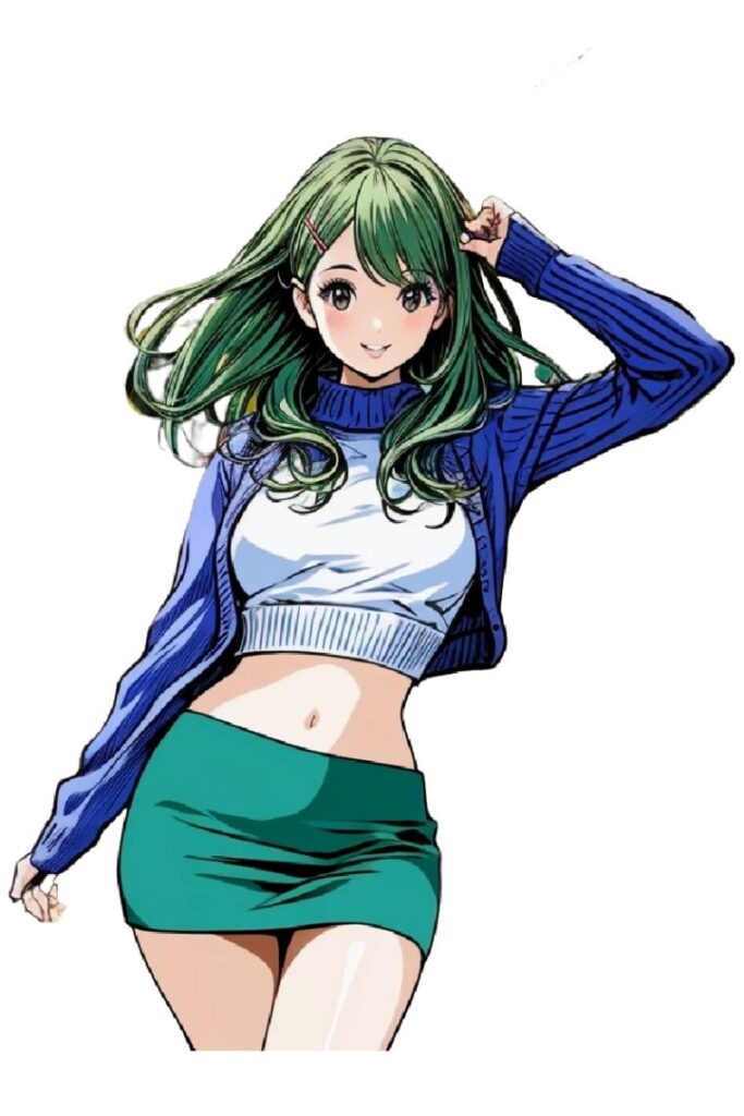 へそ出しコーデ 笑顔の彼女 へそ出しコーデでまとったセミロングの女性は、元気いっぱいに笑っています。彼女の髪はグリーンヘアーで、カールしています。 彼女のトップスは白いノースリーブで、おへそが見えるほど短いです。彼女のス